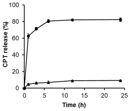 In vitro release profiles over the course of 24 h of free CPT (round) and CPT from mPEG-G3.5 (triangle).