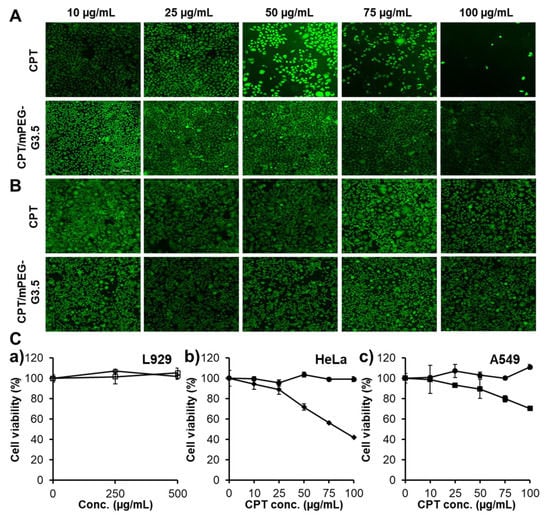 Cell viability after 24 h in percentage and fluorescent signals of HeLa (A,C-b) and A549 (B,C-c) with CPT (square) and CPT/mPEG-G3.5-CPT (round); Cell viability in percentage after 24 h of L929 (C-a) with mPEG-G3.5 (white dot) and CPT/mPEG-G3.5 (black dot)