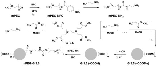 Synthetic scheme of amine-terminated poly (ethylene glycol) methyl ether (mPEG) and mPEG-G3.5 dendrimers. The terminal hydroxyl group of mPEG was converted to a primary amine by using 4-Nitrophenyl chloroformate (NPC), followed by the reaction with ethylenediamine (EDA). Amine-terminated mPEG was attached onto G3.5 dendrimer, utilizing 1-ethyl-3-(3-dimethylaminopropyl)carbodiimide (EDC) as a carboxyl activating agent.