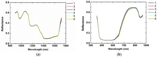 Typical Vis-NIR (visible and near infrared reflectance) hyperspectral profiles measured based on (a) system I and (b) system II for uncontaminated mulberry samples and samples contaminated with fungicide residue (concentrations of the fungicide solutions used in the samples from groups 1 to 6 were 0 g mL−1, 0.0050 g mL−1, 0.0025 g mL−1, 0.0017 g mL−1, 0.0013 g mL−1, and 0.0001 g mL−1).