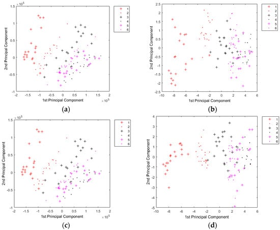 PCA plots using the LIBS data (a) before preprocessing and (b) after preprocessing, and the LIBS data combined with the HSI data (c) before preprocessing and (d) after preprocessing (concentrations of the pesticide solutions used in the samples from groups 1 to 6 were 0 g mL−1, 0.0050 g mL−1, 0.0025 g mL−1, 0.0017 g mL−1, 0.0013 g mL−1, and 0.0001 g mL−1).