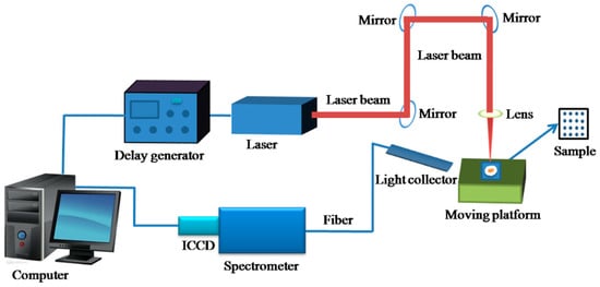 Figure 4 shows a schematic of the LIBS system. The device has a Q-switched Nd:YAG pulsed laser (Vilte-200, Beamtech Optronics Co. Ltd., Beijing, China), which has a maximum energy of 200 mJ at a harmonic wavelength of 532 nm, repetition rate of 1 to 10 Hz, pulse duration of 8 ns, and beam diameter of 7 mm. The laser was used to ablate the pelletized flake samples. The LIBS device also had an echelle spectrometer (Mechelle 5000, Andor Technology, Belfast, UK) coupled with an intensified charge-coupled device (ICCD) camera (i Star DH340T-18F-03, Andor Technology, Belfast, UK). These coupled devices were used to disperse the emission spectra and collect the spectral data. A delay generator and a plano-convex lens were used to ensure the correct delay time that would eliminate the initial emission and focus the laser beam onto the surface of the sample. An X–Y–Z moving platform was used to provide the precise movement required to accurately position the sample ablation site. The computer collects and analyzes the data. The test conditions were: delay time 4 μs, integration time 16 μs, detector gain 1500, and laser pulse energy 80 mJ. The wavelengths of the spectrograph and spectral intensity were calibrated using a mercury-argon lamp (HG-1, Ocean Optical, largo, FL, USA), and a deuterium-halogen light source was used (DH-2000-BAL, Ocean Optical, USA).