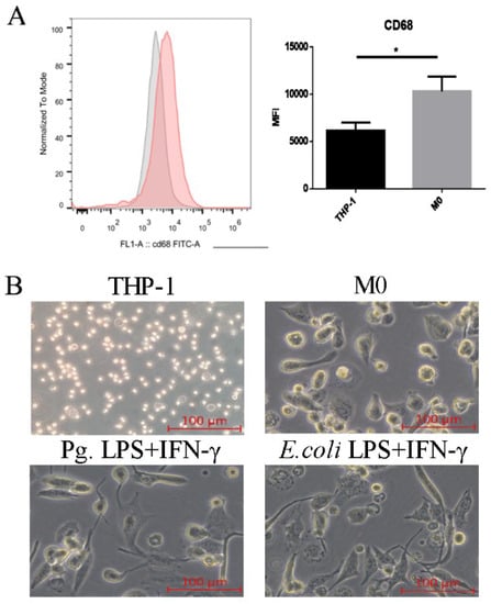Differentiation of THP-1 cells to generate macrophages. (A) Flow cytometry analyzed the expression of CD68 by THP-1 cells and M0 macrophages. (B) The cells were treated with 1640 complete medium (THP-1 group), 100 ng/mL PMA (M0 group), and 100 ng/mL Pg. LPS+10 ng/mL IFN-γ or 0.1 ng/mL E. coli LPS+10 ng/mL IFN-γ for 24 h. Morphological changes were visualized by a phase contrast inverted microscope under 100 x magnification. All of the results represent the mean ± standard deviation of three independent experiments (n = 3). * p < 0.05 indicates a significant difference compared with the control.