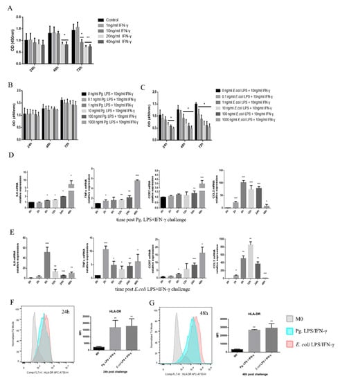 LPS/IFN-γ-induced M1 proinflammatory macrophage differentiation from M0 macrophages. (A–C) The effects of IFN-γ (A), Pg. LPS/IFN-γ, (B) and E. coli LPS/IFN-γ (C) on the proliferation of THP-1-derived macrophages were assessed. The cell growth of each group was measured by a CCK8 assay. (D,E) The mRNA expression of IL-6, TNF-α, CCR7, and CCL2 was measured by qRT-PCR in cells after stimulation with Pg. LPS/IFN-γ (D) or E. coli LPS/IFN-γ (E) for 2, 6, 12, 24, and 48 h. GAPDH was used as an internal control. (F,G) The expression of HLA-DR in macrophages was analyzed by flow cytometry. M0 macrophages were used as a control. All of the results represent the mean ± standard deviation of three independent experiments (n = 3). * p < 0.05, ** p < 0.01, and *** p < 0.0001 represent significant differences compared with the control.