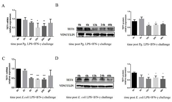 TET1 expression in M1 macrophages during LPS/IFN-γ stimulation. (A,C) The mRNA expression of TET1 was measured by qRT-PCR in cells after stimulation with Pg. LPS/IFN-γ (A) or E. coli LPS/IFN-γ (C) for 2, 6, 12, 24, and 48 h. GAPDH was used as an internal control. (B,D) The protein expression of TET1 was measured by Western blot analysis after stimulation with Pg. LPS/IFN-γ (B) or E. coli LPS/IFN-γ (D) for 6, 12, 24, and 48 h. VINCULIN was used as an internal control. All of the results represent the mean ± standard deviation of three independent experiments (n = 3). * p < 0.05, ** p < 0.01, and *** p < 0.0001 represent significant differences compared with the control.