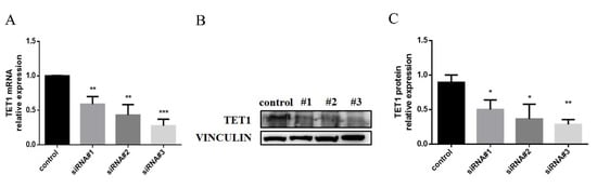 The effect of the siRNA-mediated depletion of TET1 expression in THP-1 cells. The mRNA (A) and protein (B,C) expression of TET1 was measured by qRT-PCR and Western blot analysis in THP-1 induced macrophages following siRNA treatment. VINCULIN was used as an internal control. All of the results represent the mean ± standard deviation of three independent experiments (n = 3). * p < 0.05, ** p < 0.01, and *** p < 0.0001 represent significant differences compared with the control.