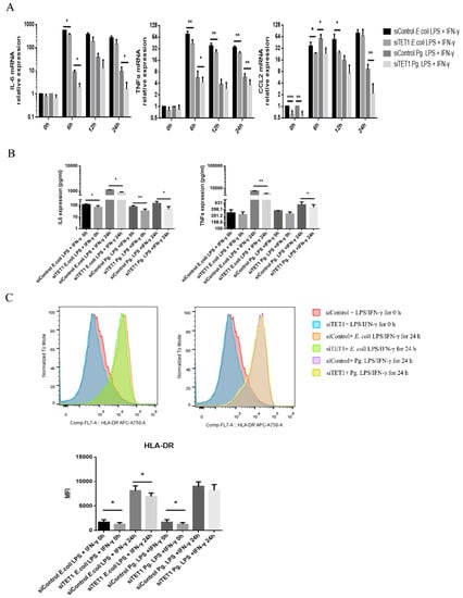 The effect of TET1 knockdown on proinflammatory markers expressed during LPS/IFN-γ-induced M1 macrophage activation. (A) qRT-PCR assessed the mRNA expression levels of IL-6, TNF-α, and CCL2 in LPS/IFN-γ-induced M1 macrophages. (B) The enzyme-linked immunosorbent assay (ELISA) was used to assess the protein expression of IL-6 and TNF-α in LPS/IFN-γ-induced M1 macrophages. (C) The protein expression of HLA-DR was analyzed by flow cytometry. All of the results represent the mean ± standard deviation of three independent experiments (n = 3). * p < 0.05 and ** p < 0.01 represent significant differences when compared with the control.