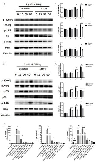 The effect of TET1 depletion on the NF-κB signaling pathway during LPS/IFN-γ-induced M1 macrophage polarization. (A,C) The levels of the phosphorylated forms of key NF-κB signaling pathway proteins were measured by Western blot analysis (A: Pg. LPS/IFN-γ. C: E. coli LPS/IFN-γ). VINCULIN was used as an internal control. (B,D) The relative quantitative analysis of the phosphorylation levels of IKKα/β, p65, and IκBα was performed by Western blot analysis (B: Pg. LPS/IFN-γ. D: E. coli LPS/IFN-γ). (E) The mRNA expression levels of IL-6, TNF-α, and CCL2 were assessed by qRT-PCR with/without pretreatment with the inhibitor BAY11-7082. GAPDH was used as an internal control. All of the results represent the mean ± standard deviation of three independent experiments (n = 3). * p < 0.05 and ** p < 0.01 represent significant differences compared with the control.