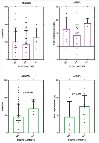 Improvement in Δ6MWD and FEV1 in patients stratified for FKBP5 rs4713916 or for GLCCI1 rs37972.