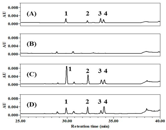High-performance liquid chromatography (HPLC) analysis of theaflavins (TFs). (A) Standard chemicals; (B) Green tea extract; (C) co-fermented green tea (CoF-GT) fraction; (D) fermented green tea (F-GT) fraction. Data were monitored at 270 nm and compounds were assigned as follows: Peak 1, theaflavin (TF); Peak 2, theaflavin-3-gallate (TF3G); Peak 3, theaflavin-3′-gallate (TF3′G); and Peak 4, theaflavin-3,3′-digallate (TFDG).