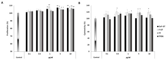 Effect of TF on human subcutaneous fat cells (hSCFs) viability. (A,B) Proliferation (A) and cytotoxicity (B) were evaluated 24 and 72 h after treatment, respectively. Data are presented as mean ± standard deviation (SD). * p < 0.05, ** p < 0.01.
