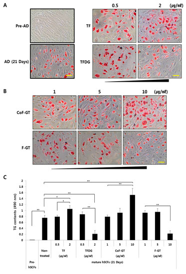 Effect of TF on hSCF differentiation. Pre- and mature adipocyte states of hSCFs fixed and stained with Oil Red O (ORO) at indicated time points and examined by light microscopy. (A) Left, untreated group; right, TF- and TFDG-treated groups used as a positive control; (B) CoF- and F-GT treated groups. Scale bar, 200 μm; (C) TG content was determined by measuring the absorbance at 490 nm. Data are presented as mean ± SD. * p < 0.05, ** p < 0.01.