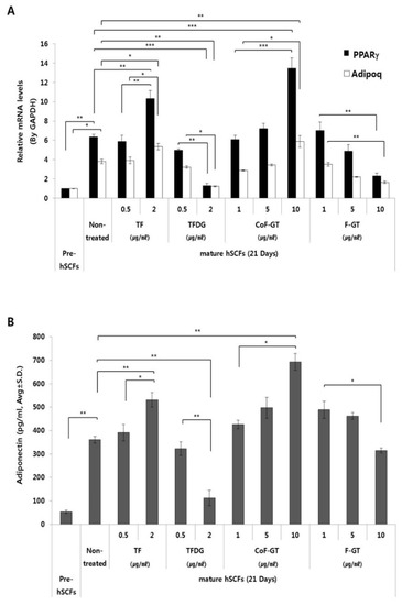 We measured the mRNA expression of lipogenesis-related genes including peroxisome proliferator activated receptor gamma (PPARγ) and adiponectin (ADIPOQ) by real-time quantitative polyperase chain reaction (RT-qPCR) (Figure 4A). The transcript level of PPARγ, a master regulator of adipogenesis, was about six times higher in mature as compared to undifferentiated hSCFs after 21 days of differentiation (Figure 4A, black bar). TF treatment increased PPARγ expression in a dose-dependent manner; however, the level was decreased and reached a minimum value upon treatment with 2 μg/mL TFDG. In the CoF-GT group, PPARγ gene expression showed a dose-dependent increase, which is in accordance with the ORO staining results (Figure 3B). Furthermore, PPARγ expression was higher in cells treated with 10 μg/mL CoF-GT than in those treated with 2 μg/mL TF, and was downregulated in a dose-dependent manner in the F-GT treatment group.