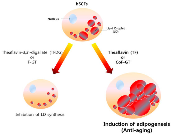 The results of this study demonstrate that TF and TF-enriched CoF-GT plays an important role in hSCF cell differentiation due to different biological effects depending on cell types whereas TFDG and conventionally fermented GT inhibits LD synthesis. Our findings suggest that with rapid fermentation and effective trans-dermal delivery, TF and TF-enriched CoF-GT can be an effective agent for preventing human skin aging.