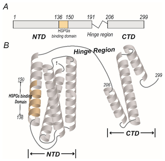 The functional domains of apolipoprotein E (ApoE). (A) The protein primary structure of ApoE. The mature ApoE protein contains 299 amino acids, with a hinge region linking two functional domains. The N-terminal domain (NTD) includes residues 1–191, and the cell surface HSPGs binding domain includes residues 136–150. The C-terminal domain (CTD) includes residues 206–299. (B) The model of the molecular structure of lipid-free ApoE. The four antiparallel α-helices of NTD form a bundle, and the cell surface HSPGs binding domain lies in the fourth α-helix. The CTD of ApoE consists of folded α-helices and is associated with the lipid binding domain.