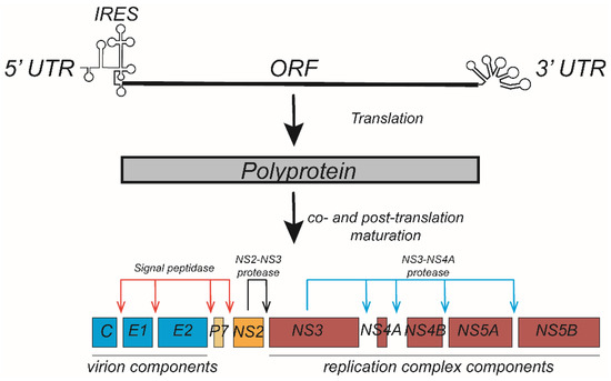 Hepatitis C virus (HCV) genome translation and polyprotein processing. The HCV genome contains an open reading frame flanked by 5′ and 3′ untranslated regions (UTRs) and encodes an approximately 3000 aa polyprotein. Translation of the polyprotein is mediated by an internal ribosome entry site (IRES) within the 5′UTR and is processed into ten viral proteins through a co- and post-translation maturation process. The virion components (core, E1, and E2 proteins) and p7 are cleaved from the polyprotein by cellular signal peptidase. NS2 is cleaved from NS3 by the protease activity of NS2, while the viral replication components (NS3-NS5B) are cleaved from one another by the NS3-4A protease.
