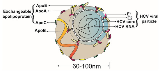 - Chang, K.-S.; Jiang, J.; Cai, Z.; Luo, G. Human Apolipoprotein E Is Required for Infectivity and Production of Hepatitis C Virus in Cell Culture. J. Virol. 2007, 81, 13783–13793. [Google Scholar] [CrossRef]