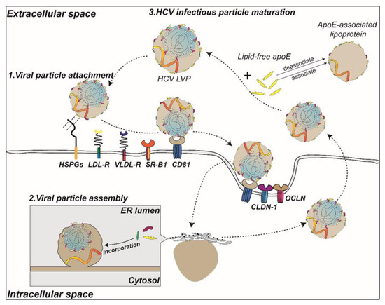 A model of the role of ApoE in the life cycle of HCV. The circulating HCV infectious particles bind to HSPGs and receptors (LDLr, VLDLr, and SR-B1) on the cell surface via ApoE prior to entering cells via interactions with CD81, claudin-1 (CLDN-1) and occludin (OCLN). Subsequently, in the lumen of the endoplasmic reticulum, apolipoproteins such as ApoE are incorporated into lipid droplets that encapsulate the HCV nucleocapsid, which is embedded with E1E2 heterodimers to participate in the assembly process. In addition, the binding of extracellular ApoE to secreted HCV particles assists in the maturation of HCV LVPs.