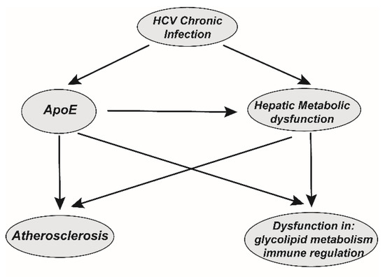 The importance of ApoE in lipid metabolism was recognized decades ago. In animal models, ApoE deficiency is associated with atherosclerosis [81], while ApoE deficiency can also result in a reduction in anti-inflammatory M2 macrophages [4]. Therefore, persistent sApoE is hijacked by HCV in the extracellular environment, which may lead to abnormalities, such as insulin resistance in the pancreas and the formation of foam cells in the vascular intima, which may further promote metabolic tissue dysfunction. The assembly, release, infection and immune evasion of HCV can be modulated inside or outside of hepatocytes by the binding or utilization of the host ApoE. Thus, in the long-term chronic infection process HCV causes the abnormal function of ApoE, and investigation of the relationship of these factors may help us understand the cause of HCV-associated metabolic syndrome (Figure 5). However, whether this process leads to HCV-associated metabolic syndrome requires further research.