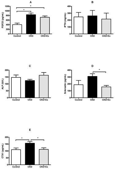 Serum biomarkers in the experimental groups. (A) Serum FGF-23 levels in rats from the CKD and the CKD + exercise (Ex) groups were higher than those from the sham group. (B,C) Serum intact parathyroid hormone (iPTH) and alkaline phosphatase (ALP) levels did not show significant differences between the three groups. (D) Serum sclerostin levels in rats from the CKD + exercise group were lower than those in rats from the CKD group. (E) Serum levels of CTX-1, a bone resorption marker, in rats from the CKD group were higher than those in rats from the CKD + exercise and the sham groups. N = 8, 13, and 9 in the control, CKD, and CKD + exercise groups, respectively. All data have been presented as mean ± SEM. * p < 0.05.
