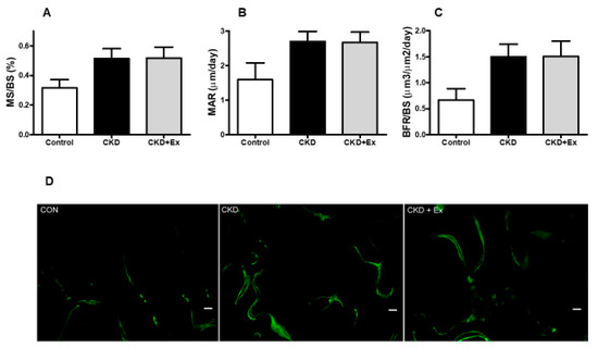 Dynamic bone histomorphometric parameters and micro-CT bone scanning. Dynamic bone histomorphometric parameters (A–C), and dynamic histology (D) did not show significant differences between the CKD and CKD + exercise groups. N = 8, 13, and 9 in the control, CKD, and CKD + exercise groups, respectively. Mineralization over bone surface, MS/BS; Mineral apposition rate, MAR; Bone formation rate per bone surface, BFR/BS. All data are represented as mean ± SEM. Scale bar = 50 μm.