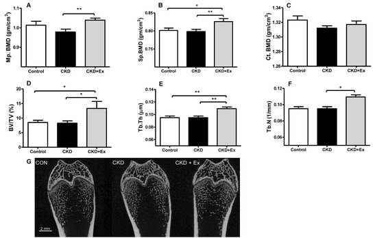 Bone mineral density (BMD) and bone microarchitecture parameters. Distal femoral metaphysis (Mp.) and L5 vertebrate (Sp.) bone mineral density was significantly higher in rats from the CKD + exercise group than in rats from the CKD group (A,B). Cortical bone density did not show significant differences between the groups (C). Trabecular bone volume (BV/TV), trabecular thickness (Tb.Th), and trabecular number (Tb.N) were significantly higher in rats from the CKD + exercise group (D–F), relative to those from the CKD group. Micro-CT scanning demonstrated that the trabecular bone in rats from the CKD group was looser than that in rats from the CKD + exercise group (G). N = 8, 13, and 9 in the control, CKD, and CKD + exercise groups, respectively. Values are represented as mean ± SEM. * p < 0.05, ** p < 0.01. Scale bar = 2 mm.