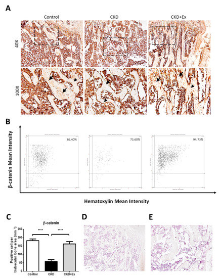 β-catenin immunohistochemistry on osteocytes in the tibial trabecular bone. (A) Protein expression of β-catenin in the trabecular bone of rats was determined by IHC assay. Rats from the CKD + exercise group showed a higher β-catenin staining signal on osteocytes than in case of rats from the CKD group. The arrows indicate the positive cells. The arrowheads indicate the negative cells. (B) Representative images of tissue cytometry using HistoQuest software. β-catenin-immunoreactive (IR) positive and negative cells were counted and the signal intensity was quantified. (C) Images are representative and quantification data are presented as the mean ± SD from 5 rats in each group. The CKD group showed a significant difference compared to the CKD + exercise and sham groups (**** p < 0.0001). The CKD + exercise group showed no significant difference compared to the sham group. The analysis was performed using the One way-ANOVA test. (D) 40× and (E) 100× images of the negative control without primary antibody.