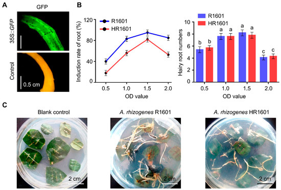 The establishment of peanut hairy root protein expression system. (A) Green fluorescence Pof the peanut hairy roots detected by fluorescent inverted microscopy. 35S::GFP, peanut hairy roots developed from leaves infected with the recombined GFP construct. Control, peanut hairy roots developed from leaves infected with Agrobacterium rhizogenes R1601. (B) The induction rate and total numbers of peanut hairy roots inoculated with various concentrations of R1601 and HR1601 (Agrobacterium rhizogenes R1601 transformed with human epidermal growth factor (hEGF)). The best induction rate is obtained when its OD600 value reached 1.5 both for R1601 and HR1601. Error bars indicate SEM (n = 3), p < 0.05. One-way ANOVA Duncan’s test is used for statistical analysis. Statistical differences are indicated by lowercase letters and different letters represent different significance. This experiment was repeated three times with similar results. (C) Peanut leaves infected with Agrobacterium rhizogenes R1601 or HR1601 with hairy roots formation. Blank control, non-infected peanut leaves with no hairy roots formation.