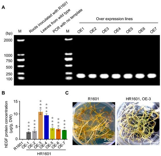 To identify the positive transformed roots of hEGF, PCR assay was performed using the DNA extracted from hairy roots inoculated with R1601 or HR1601 as the template. Seven possibly hEGF overexpression lines were obtained, which demonstrated that the hEGF gene was successfully transformed into hairy roots (Figure 2A). To confirm whether the hEGF gene integrated into the peanut genome and had the ability for expressing the target protein, a special ELISA assay was performed, which hEGF peptide was designed as the special antigen. As shown in Figure 2B, hEGF was successfully expressed in all overexpression lines, and the protein concentration of hEGF was highest in OE-3 line.