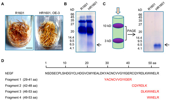 To further confirm the protein expressed by hairy roots was hEGF, hairy roots of OE-3 were cultured in large scale in 100 mL of MS liquid medium for total protein extraction, and the roots infected with R1601 were used as the negative control (Figure 3A). As shown in Figure 3B, a band near 6.5 kDa (hEGF ≈ 6 kDa) could be clearly observed in the SDS-PAGE gel. Subsequently, the total amount of protein was filtered with a Millipore super filter, and the proteins between 3 kDa and 10 kDa were retained. Then, the proteins between 3–10 kDa were separated by SDS-PAGE again to isolate the hEGF protein and remove impurities as much as possible (Figure 3C). It can be seen that the target protein was well separated, and the protein bond approximately 6 kDa was subsequently cut and identified by matrix-assisted laser desorption/ionization time of flight mass spectrometry (MALDI-TOF-MS) analysis (Supplementary Figure S1). Blast analysis showed that the four identified peptides could match the protein sequence of hEGF and cover a total of 25 amino acid sequences from the 29th to the 53th, with a total protein coverage of 47%, which gave the strong evidence that the protein expressed and purified in peanut hairy roots was hEGF (Figure 3D).