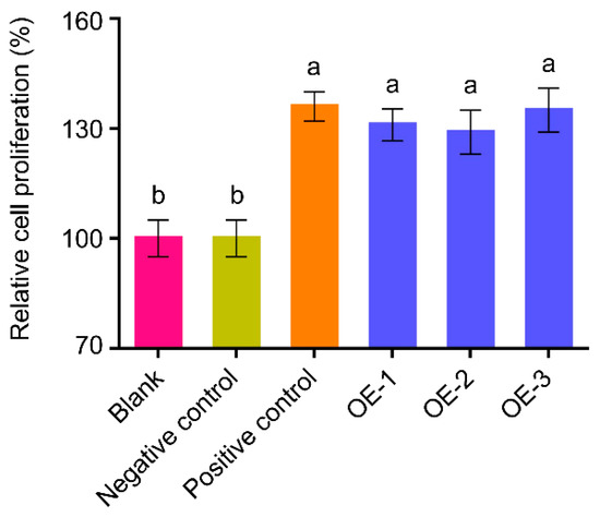 The hEGF protein purified in peanut hairy roots has biological activity. Biological activity of hEGF on human liver cells. Blank, the normal human liver cell HL-7702 cells; Negative control, the interception proteins from hairy roots infected with R1601 are supplemented with HL-7702 cells; Positive control, the hEGF peptide obtained from Sangon (Shanghai, China); OE-1, OE-2 and OE-3, the interception proteins from three independent hEGF transgenic peanut hairy root lines are each supplemented with HL-7702 cells. Error bars indicate SEM (n = 3), p < 0.01. One-way ANOVA Duncan’s test is used for statistical analysis. Statistical differences are indicated by lowercase letters and different letters represent different significance. These experiments were repeated three times with similar results.