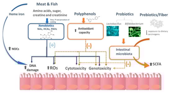 In the last decade, major emphasis has been placed on the link between the ingestion of thermally processed foods and the risk of CRC. Xenobiotics with potential carcinogenic activity can be generated from meat and fish components through some cooking procedures with high temperatures. These compounds include mainly NOCs, PAHs and HCAs. HCAs have accumulated the strongest scientific evidence as a CRC risk factor in epidemiological and interventional studies. The presence of xenobiotics from food processing contributes to an increase in local genotoxicity, which has been related to an increase in CRC risk. The intestinal microbiota can modify the toxicity of dietary xenobiotics by direct microbial interference with these compounds and/or by modulating host-microbiota interactions through diverse mechanisms. However, diet and dietary components could interact either with the intestinal microbiota or with xenobiotics, contributing to altered gut toxicity. Therefore, the interaction between dietary components and intestinal microbiota could be considered a modifiable factor for the development of CRC in humans. Thus, more studies are needed to determine the long-term impact of xenobiotics derived from food processing on CRC. Specific nutrients, probiotics and prebiotics/fibres have the capacity to reduce intestinal toxicity; their mechanisms of action and efficacy should be carefully evaluated for use as food agents for CRC prevention.