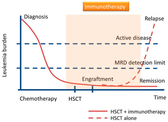 Allogeneic hematopoietic stem cell transplantation (allo-HSCT) has been recognized as the only curative therapy for patients with acute myeloid leukemia (AML). Allo-HSCT’s mode of action is primarily attributed to the graft-versus-leukemia (GVL) effect mediated by donor T-cells and natural killer (NK) cells. However, approximately 40% of the AML patients who undergo allo-HSCT will relapse, and the two-year post relapse survival among these patients is less than 20% [1,2,3,4,5,6]. With the use of targeted sequencing or flow cytometry, the persistent detection of minimal residual disease (MRD) is associated with post-transplantation relapse [7,8,9]. It is therefore important to provide additional therapies to eliminate MRD after allo-HSCT, particularly in high-risk AML. Donor lymphocyte infusion (DLI) or repeat allo-HSCT as a donor cell-based therapy has been associated with improved survival in patients who relapse after allo-HSCT [1,2,3,5,10]. Although the efficacy of therapeutic DLI in relapsed AML may be suboptimal, pre-emptive, or prophylactic, DLI may have an important role [5,11,12,13]. Use of the hypomethylating agent azacitidine appears to be effective in AML following allo-HSCT [14,15]. Additionally, pre-emptive treatment with azacitidine may prevent a relapse while monitoring for MRD (NCT01462578) [16].