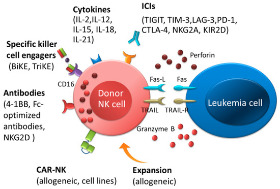 Natural killer (NK) cell immunotherapies after allo-HSCT therapeutic approaches for the elimination of AML. NK cells-based immunotherapeutic concepts are based on stimulating NK cells by cytokines or immune checkpoint inhibitors, promoting antibody-dependent T-cell-mediated cytotoxicity by antibodies or bispecific and trispecific killer cell engagers, and improving NK cell responses by adoptive transfer of NK cells, such as allogenic NK cells or chimeric antigen receptor NK cells. Abbreviations: ICIs, immune checkpoint inhibitors; BiKEs, bispecific killer cell engagers; TriKEs; trispecific killer cell engagers; CAR, chimeric antigen receptor.
