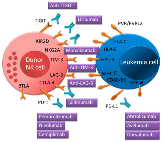 TIM-3 is expressed on all mature CD56dimCD16+ NK cells and activated immature CD56brightCD16− NK cells. Its ligand is galectin-9 [72], which induces interferon-gamma (IFN-γ) production by NK cells [73]. TIM-3 blockade restores NK cell exhaustion and leads to an increased NK cell cytotoxicity in several cancers [74,75], whereas the TIM-3 antibody agonist leads to a decrease in the cytotoxicity of NK cells [72]. TIM-3 blockade reduces NK cell-mediated killing of pancreatic cancer cell lines [76]. Although a phase 1 study evaluating the blockade of TIM-3 (TSR-022) in advanced solid tumors is in progress (NCT02817633), further studies will be needed to determine the precise role of TIM-3 in AML after allo-HSCT.