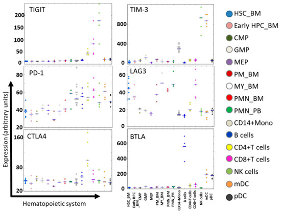 Expression of immune checkpoint receptors in normal hematopoiesis. Expression levels of TIGIT, TIM-3, PD-1, CTLA-4, LAG-3, and BTLA in the hematopoietic system at different maturation stages are shown according to HemaExplorer54,55, based on curated microarray data. Abbreviations: HSC_BM, hematopoietic stem cells from bone marrow; early HPC_BM, hematopoietic progenitor cells from bone marrow; CMP, common myeloid progenitor cell; GMP, granulocyte monocyte progenitors; MEP, megakaryocyte-erythroid progenitor cell; PM_BM, promyelocyte from bone marrow; MY_BM, myelocyte from bone marrow; PMN_BM, polymorphonuclear cells from bone marrow; PMN_PB, polymorphonuclear cells from peripheral blood; B-cells, CD19+ B-cells; NK cells; CD56+ natural killer cells; mDC, CD11c+ myeloid dendritic cells; pDC, CD123+ plasmacytoid dendritic cells.