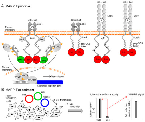 The expansion of the protein interactomics field is driven by a wide variety of techniques for the detection of protein-protein interactions (PPIs). Classical techniques, such as yeast two-hybrid [1] and affinity-purification coupled to mass spectrometry [2], have been complemented with new and improved approaches. These enable the study of PPIs at their subcellular location [3,4] or in a physiological context between weak and transient interactions [5,6,7], full-length integral membrane proteins [8] and post-translationally modified proteins [9]. Our laboratory developed the mammalian protein-protein interaction trap (MAPPIT), a method combining many of these traits. MAPPIT is based on the Janus kinases-signal transducers and activators of the transcription (JAK-STAT) signalling pathway of type I cytokine receptors upon bait and prey interaction (Figure 1A). The MAPPIT bait is fused to a signalling-deficient chimeric receptor comprising an extracellular cytokine receptor domain and a mutant intracellular receptor domain, lacking STAT3 recruitment sites. The prey is coupled to a gp130 fragment. Upon cytokine stimulation, bait-prey interaction leads to phosphorylation and the recruitment of STAT3 to the gp130 fragment, complementing the JAK-STAT signalling pathway, resulting in luciferase reporter gene activation. As MAPPIT acts in intact mammalian cells, it allows the detection of proteins requiring intracellular cofactors or post-translational modifications (PTMs) [10]. A typical MAPPIT experiment simply involves co-transfection of three plasmids in HEK293T cells: a bait, a prey, and a STAT3-inducible luciferase reporter plasmid (Figure 1B). Interaction between bait and prey protein is detected by luciferase activity induced after stimulation with erythropoietin (Epo) or leptin, depending on the extracellular domain of the bait. MAPPIT can detect up to one third of all protein interactions in high-throughput screening modus but this number can probably be increased by switching bait and prey, using different bait constructs or using domains instead of full-length proteins [11,12,13].