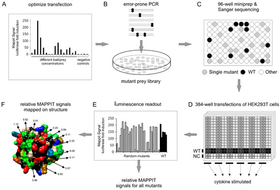 6-step workflow of the MAPPIT-based interface mapping method. (A) MAPPIT transfection conditions are optimized by varying the concentration of bait and prey plasmids and by switching the bait and prey proteins. (B) The target protein is randomly mutated via error-prone polymerase chain reaction (PCR). The linear PCR product is cloned into the MAPPIT prey plasmid vector and electroporated into E. coli DH10B cells, resulting in the MAPPIT mutant prey library. (C) Individual E. coli colonies are inoculated in 96-deepwell blocks. Mutant prey DNA is isolated via a 96-well DNA miniprep protocol and sequenced by Sanger sequencing. (D) MAPPIT prey mutants harbouring a single missense mutation are co-transfected with the MAPPIT bait and STAT3 luciferase reporter plasmids in 384-well plates seeded with HEK293T cells. (E) After cytokine stimulation via Epo or leptin, the luciferase activity is measured and relative MAPPIT signals are calculated. (F) The relative MAPPIT signal of each mutant is determined and mapped on the protein structure.
