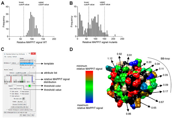 First, we create an “attribute list” in a fixed .txt format in which the relative MAPPIT signal of a mutant is assigned to its corresponding residue number. This attribute list is then loaded in the free modelling program University of California San Francisco (UCSF) Chimera via its “define attribute” tool [20]. The relative MAPPIT signals of the mutated residues are mapped on the template structure using the “render by attribute” tool (Figure 3C). Based on the histogram of the relative MAPPIT signals, up to three threshold values with respective colours can be determined. The colour intensity of each mutated residue depends on the proximity of its relative MAPPIT signal to the thresholds in the histogram.