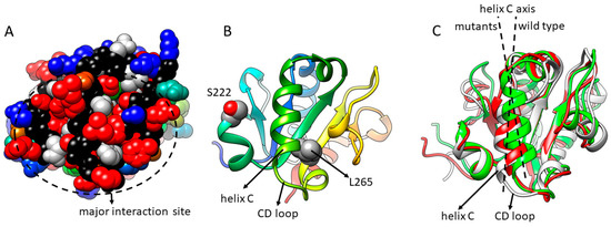 Our MAPPIT studies could nicely reproduce effects that were observed in vivo. As a viral defence against the human host restriction factor Apobec3G, this protein is degraded by HIV-1 Vif via ubiquitination mechanisms. A D128K mutation protects simian Apobec3G against degradation via HIV-1 Vif. Via MAPPIT, we could demonstrate that the Apobec3G D128K mutation specifically breaks the Apobec3G-Vif interaction [25]. Mice containing mutations in the TIR domain of TLR4 have a reduced TLR4 innate immune response and are susceptible to infections [26]. Via MAPPIT, we could confirm that these mutations disrupt the TIR-TIR interactions of the TLR4 TIR domain [18]. This suggested that MAPPIT can be used to help to explain the underlying cause of phenotypes in diseases. Our study of MyD88 illustrates best how MAPPIT combined with random mutagenesis indeed helps to understand the molecular mechanism of disease (Figure 4). A somatic L265P mutation in MyD88 is found in more than 90% of all Waldenström macroglobulinaemia B-cell malignancy patients [27]. Using MAPPIT, we demonstrated that the L265P mutation and a S222R mutation both lead to increased interactions between the MyD88 TIR domains, which appear to be associated with increased NF-κB activation [19]. The S222R mutation was generated by random mutagenesis but was almost simultaneously found as a de novo mutation in a unique case of severe juvenile arthritis [28]. Via molecular dynamics, we could demonstrate that both mutations induce a significant tilt of the alpha C-helix and rearrangement of the CD loop [19,28]. Random mutagenesis and MAPPIT analysis of MyD88 demonstrated that helix C and part of the CD loop are central in one of the three major interaction surfaces of the MyD88 TIR domain (Figure 4A,B) [19]. This suggests that two mutations in two very different diseases induce the hyperactivation of MyD88 by modifying one of its interaction surfaces, priming it for interaction.