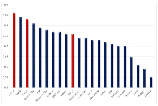 Finally, Figure 1 graphically compares the performances of the reported consensus models including one, two and three variables with those reported by an extended set of benchmarking analyses including the three above considered studies. Even though this comparison is far from being exhaustive and many studies based on the DUD datasets are not here considered, Figure 1 clearly confirms the remarkable reliability and the encouraging performances provided by the presented consensus strategy based on the EFO algorithm. In detail, the generated linear combinations with two and three scores yield highly performing models which are placed in the top (with three variables) and third (with two variables) position in the performance ranking. Interestingly, the still satisfactory performances reached when utilizing one-variable models emphasize the beneficial role exerted by the rescoring procedures, which prove to be a successful method to optimize the reliability of a single docking simulation.