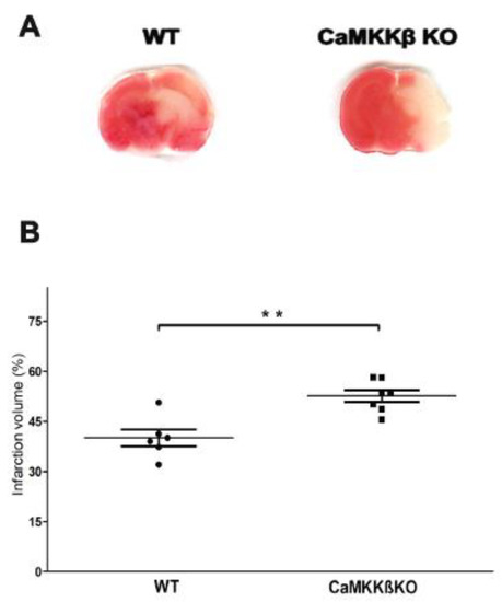 We compared the infarction sizes of neonatal CaMKK β knockout (KO) mice and wild-type littermates (WT) at 24 h after HI. As shown in Figure 1A,B, CaMKK β KO mice had larger infarcts than the WT mice (WT 40.06 ± 2.50% versus KO 52.61 ± 1.78%, ** p < 0.01; n = 6–7 per group).