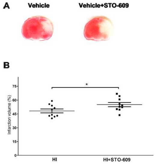 A pan inhibitor, STO-609, was administered intraperitoneally to WT mice to confirm the detrimental effects of CaMKK genetic deletion. Inhibition of CaMKK β exacerbated HI-induced infarct size (Figure 2A,B, vehicle treated 48.25 ± 2.10% versus STO-609 treated 55.12 ± 2.25%, * p < 0.05; n = 10 per group). Our findings indicated that the genetic deletion and pharmacological inhibition of CaMKK β aggravated the brain injury after HI in WT mice. It is noteworthy that the control groups of Figure 1 and Figure 2 did not have similar infarct sizes, which highlights the importance of using littermates as appropriate controls for KO mice experiments.