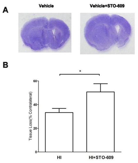 The suppression of CaMKK β increased HI-induced tissue loss after long-term survival. (A) Representative brains with tissue loss in vehicle- and STO-609-treated mice 21 days after HI. (B) Quantification of brain tissue loss resulting from HI, (n = 6 for each group, * p < 0.05 versus vehicle treated mice; vertical bars indicate SEM).