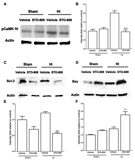 The inhibition of CaMKK β reduced pCaMK IV, Bcl-2, collagen IV and claudin-5 but increased Bax after HI. (A,C,D) Representative western blots of pCaMK IV, Bcl-2 and Bax in vehicle and inhibitor groups. (B,E,F) Quantification of pCaMK IV, Bcl-2 and Bax expression, (n = 3 for each group, ** p < 0.01, *** p < 0.001 versus vehicle treated HI mice; vertical bars indicate SEM).