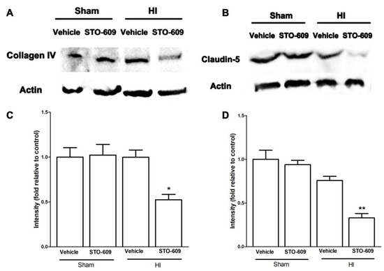 Representative western blots of collagen IV (A) and claudin-5 (B) in vehicle and inhibitor groups. (C,D) Quantification of collagen IV and Claudin-5 expression, (n = 3 for each group, * p < 0.05, ** p < 0.01 versus vehicle treated HI mice; vertical bars indicate SEM).