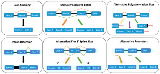 - Kornblihtt, A.R.; Schor, I.E.; Allo, M.; Dujardin, G.; Petrillo, E.; Munoz, M.J. Alternative splicing: A pivotal step between eukaryotic transcription and translation. Nature reviews. Mol. Cell Biol. 2013, 14, 153–165. [Google Scholar]