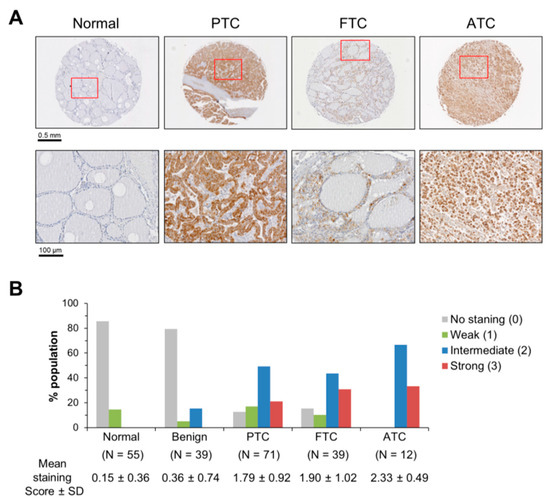 Formalin-fixed, paraffin-embedded 5 µm sections of non-overlapping thyroid carcinoma tissue microarrays (TH208, TH801, TH802, and TH806), containing 71 PTC cases, 39 FTC cases, 12 ATC cases, 39 benign thyroid tumor cases, and 55 normal thyroid samples, were purchased from US Biomax (Rockville, MD). The manufacturer-supplied de-identified clinical information is listed in Supplementary Materials, Table SI. All tissue samples consisted of uniform cores, 1.5 mm in diameter. The specimens were analyzed using monoclonal anti-mortalin antibody, D-9 (Santa Cruz Biotechnology, sc-133137), as previously described [12]. The specificity of this staining was validated with normal IgG type 2.