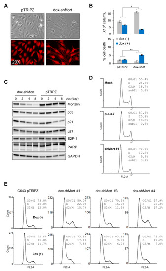Mortalin knockdown induces growth inhibition in the ATC cell line, C643. (A–C) C643 cells were infected with the lentiviral pTRIPZ-dox-shMort or the empty pTRIPZ. (A) Dox-induced RFP expression indicates infection efficacy. (B) Trypan blue exclusion analysis of live and dead cells at dox treatment day 8 (mean ± SD, n = 3), * p < 0.05; ** p < 0.005. (C) Western blot analyses of total cell lysates harvested at indicated dox treatment days. GAPDH is the control for equal amounts of protein loading. (D) Cell cycle analysis of C643 cells infected for 4 days with the lentiviral pLL3.7 expressing shRNA that targets mortalin mRNA (shMort #1). shMort#1 and pTRIPZ-dox-shMort target different regions of mortalin mRNA. Uninfected (mock)- or empty virus-infected cells were used for comparison. Knockdown efficiency is shown in Supplemental Figure S2. (E) Cell cycle analysis of different clones of C643 stably infected with pTRIPZ-dox-shMort (#1, #3, and #4) after 8 day dox treatment. Western blot data of these clones are shown in Supplemental Figure S3.