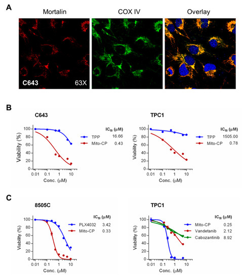 Mito-CP suppresses viability of PTC and ATC cells. (A) Immunofluoresence analysis of mortalin localization in C643 cells. cytochrome c oxidase (COX IV) serves as a marker specific to mitochondria. Areas of overlap are seen as yellow. (B) C643 and TPC-1 cells in 96-well plates were treated with serially increasing doses of Mito-CP or the control compounds, TPP, for 48 h. Cells were then allowed to recover in drug-free fresh medium for 24 h prior to measuring cell viability by 3-(4,5-dimethyl-2-thiazolyl)-2,5-diphenyltetrazolium bromide (MTT) assay. Data (mean ± SD, n = 4) are expressed as the percentage of untreated control. (C) Cells of 8505C and TPC-1 were treated with increasing doses of Mito-CP, PLX4032, vandetanib, or cabozantinib for 48 h. Cells were then allowed to recover in drug-free fresh medium for 24 h prior to MTT assay.